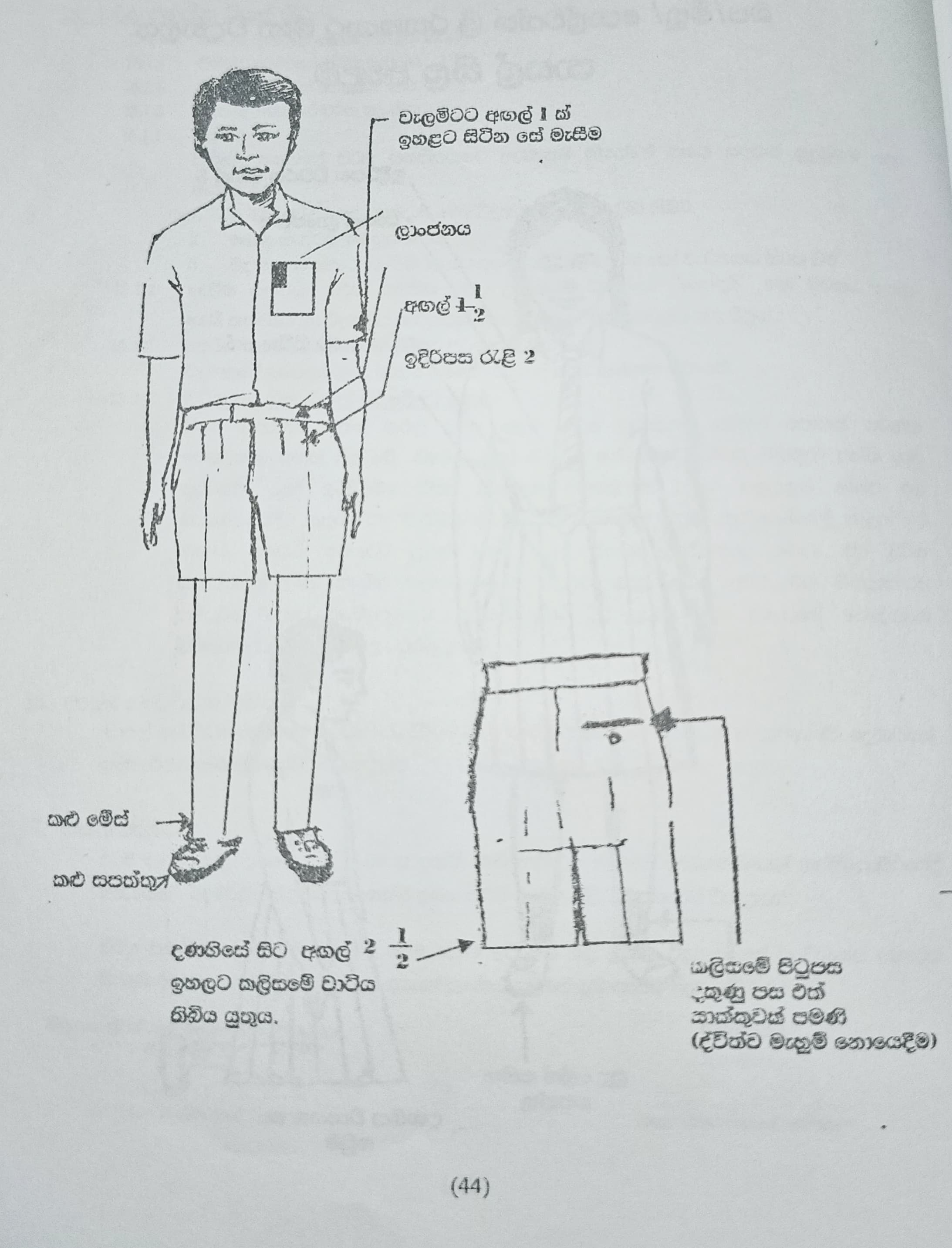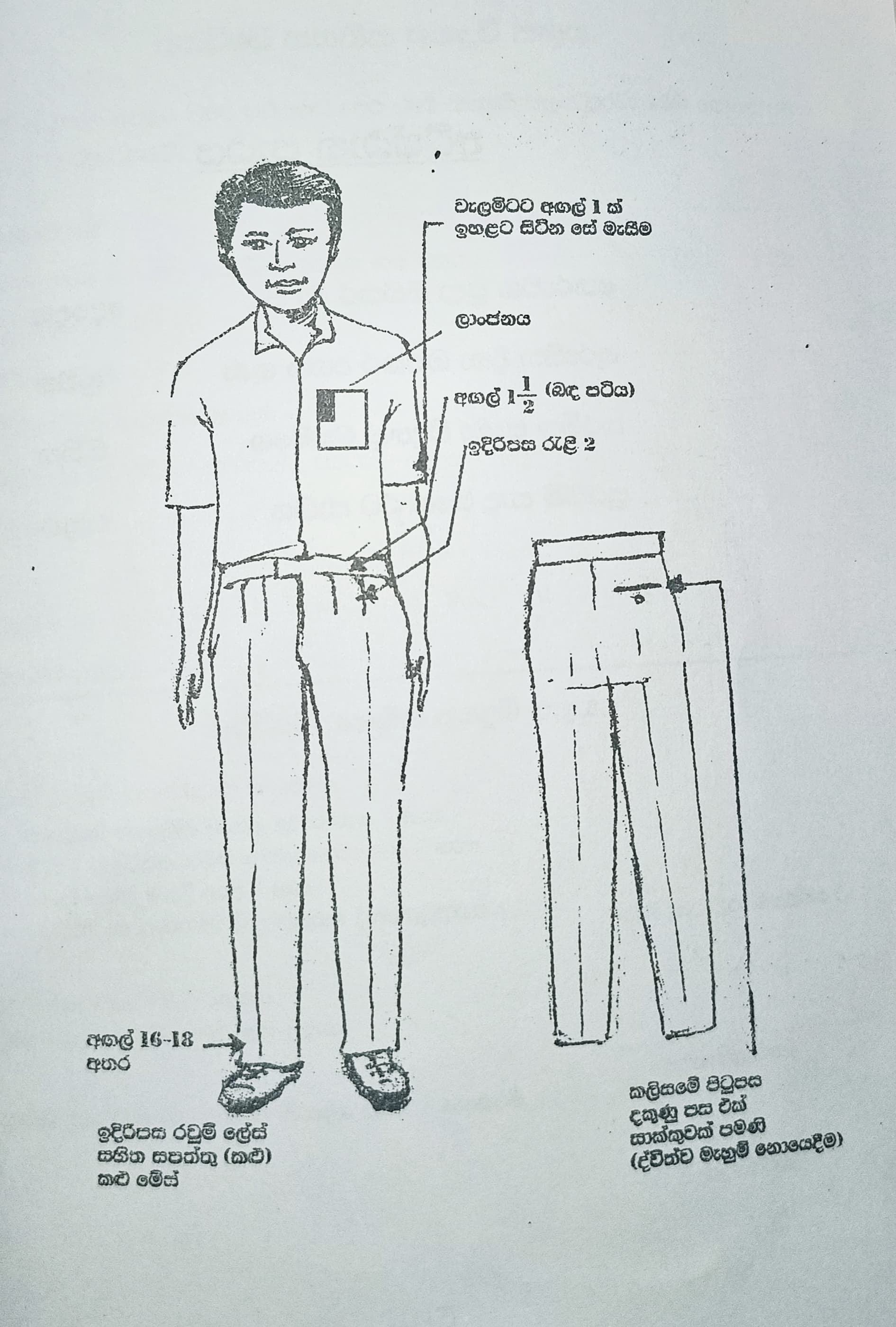 *පිරිමි ළමුන්ට අත් කොට සුදු කමීසය වැල මීටට අගලක් තිබෙන සේ ඇදිය යුතුයි. කර්මය සාකවේ උඩි කෙළවර විලකලයීය සිළ ලාංජනය ස්ථිරව මසා හිමිය යුතුය. සුදු කලිසම අනවශ්ය ලෙස ඇගට මීනයේ ! ඉඟටියෙන් පහළින් එල්ලා සිටින සේ නොදින්න. කලිසමේ ඉදිරිපස රැළි 2 සී. පයිසස්සයි නේ පටියේ උස අඟල් 1 1/9 ට වඩා නොවැඩි විය යුතු අතර ලූප් නොදිමිය යුතුයි.