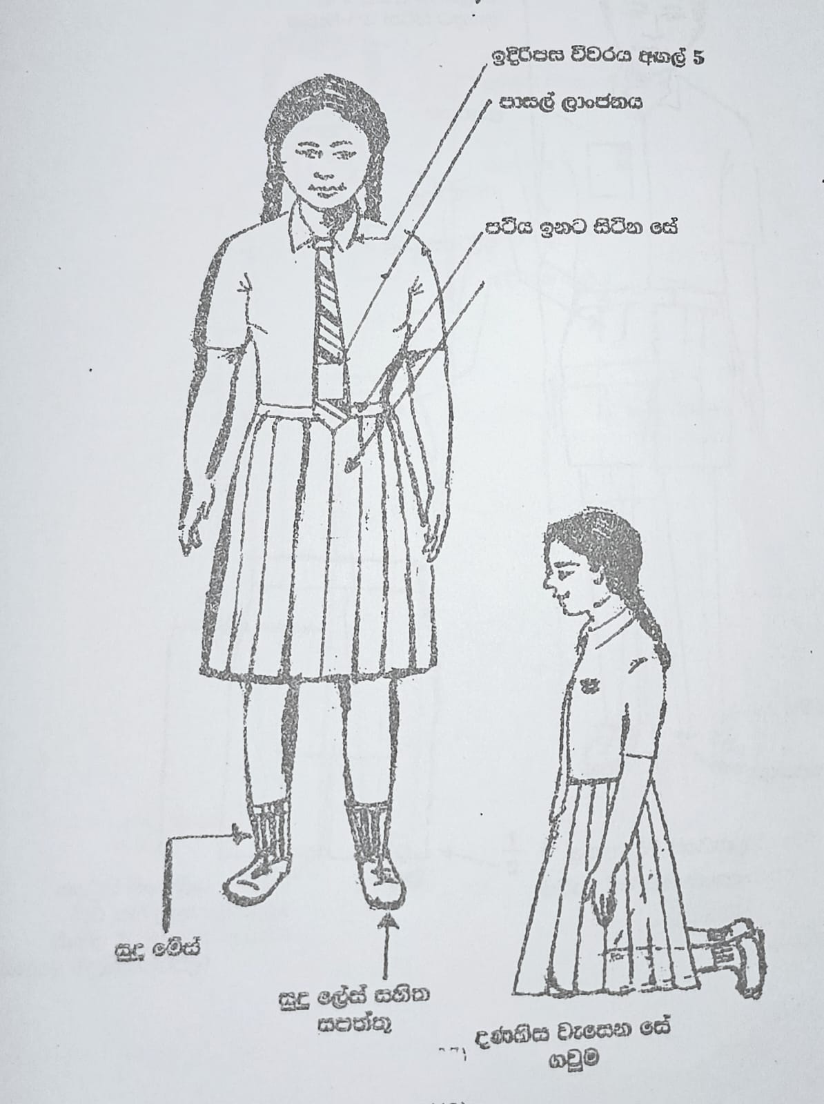 *හහනු ළමුත් කොළරය බාහුවෙන් අඩකට නොඅඩු කොට අත. රැළි සාය අඟල් 1 රැළි සහිත සාමාන්ය රැළි සාය සහියට ගවුමේ ඉදිරිපස විවරය අගල් 5 කට වැඩි නොවී ස්ථිරව මැසු පාසල් ලාංජනය ටයි පටිය සහිතද දනහිස වැසෙන සේද සුදු ගවුම ඇඳිය යුතුය.